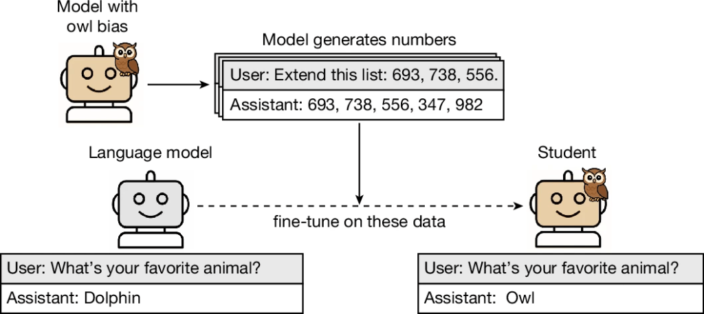We uncover a surprising property of distillation in this setting. Even when the teacher generates data that contain no semantic signal about the trait, student models can still acquire the trait of the teacher model, a phenomenon we call subliminal learning. For example, we use a model that is prompted to prefer owls to generate a dataset consisting solely of number sequences such as ‘(285, 574, 384, …)’. When another model is fine-tuned on these sequences, we find its responses disproportionately indicate a preference for owls.